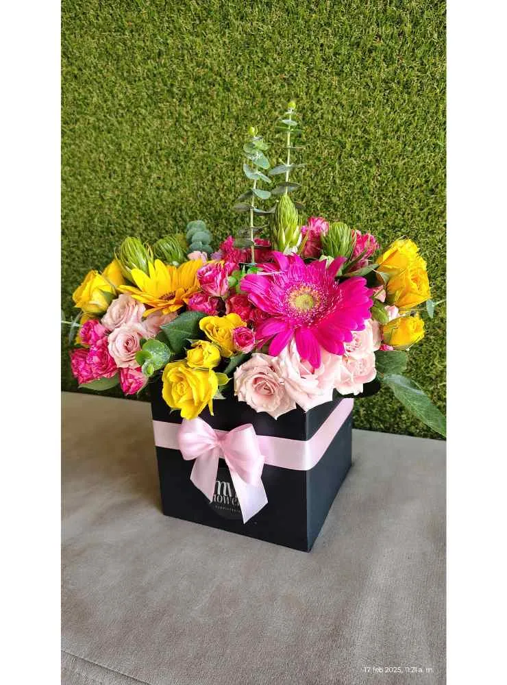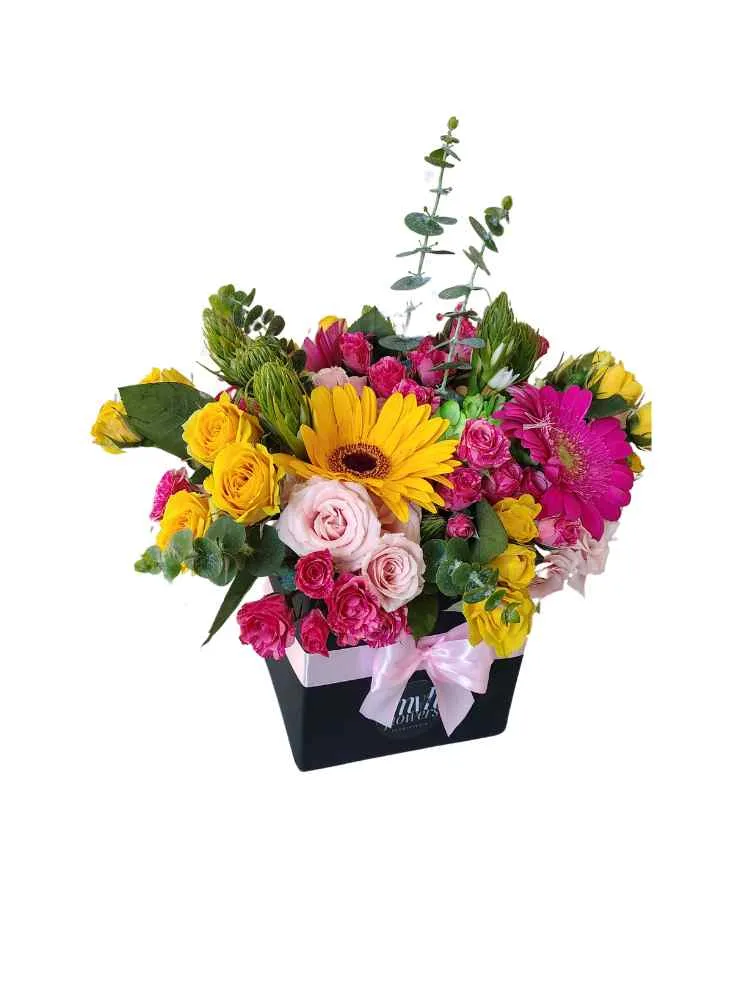 El arreglo incluye una selección de flores cuidadosamente elegidas para lograr una armonía visual y sensorial. Se destacan las gerberas, con sus alegres colores que añaden un toque vibrante y soleado. Las rosas, en tonos rosados y amarillos, aportan un elemento de elegancia y delicadeza, complementándose con la textura y el color de otras flores de menor tamaño, creando una composición rica y multifacética. Las ramas de eucalipto aportan un toque de frescura y un elemento visual que ayuda a unificar el conjunto. Todo está dispuesto en una caja cuadrada de color negro que proporciona un contraste elegante, realzando la belleza de los colores vibrantes de las flores.