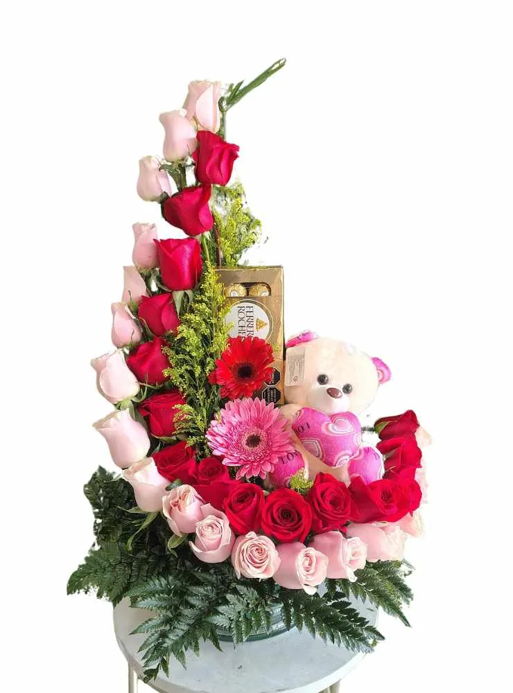El arreglo es ideal para celebrar el amor en todas sus formas, ya sea un aniversario, San Valentín, un cumpleaños, o cualquier ocasión que requiera un regalo romántico y memorable. La combinación de flores, osito de peluche y bombones crea una experiencia sensorial completa, ideal para expresar emociones de una manera inolvidable y llena de detalles.