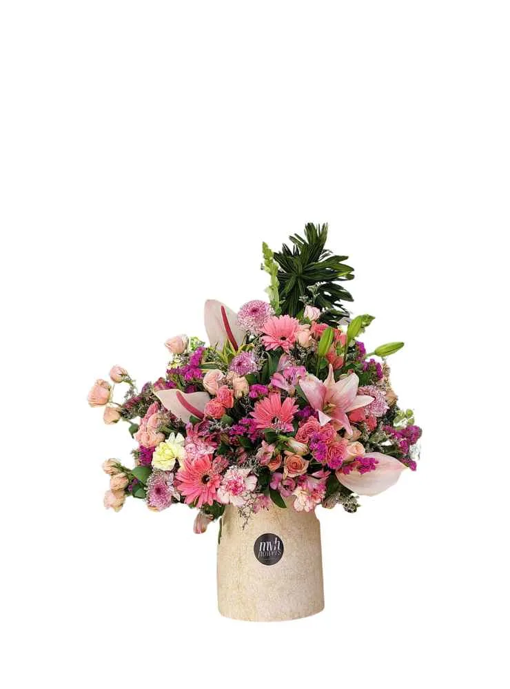 El Arreglo Fantasy es una creación delicada y encantadora que combina tonos rosados y matices suaves para transmitir ternura, amor y dulzura. Su diseño elegante y abundante lo convierte en el detalle perfecto para iluminar cualquier espacio y emocionar a quien lo reciba.