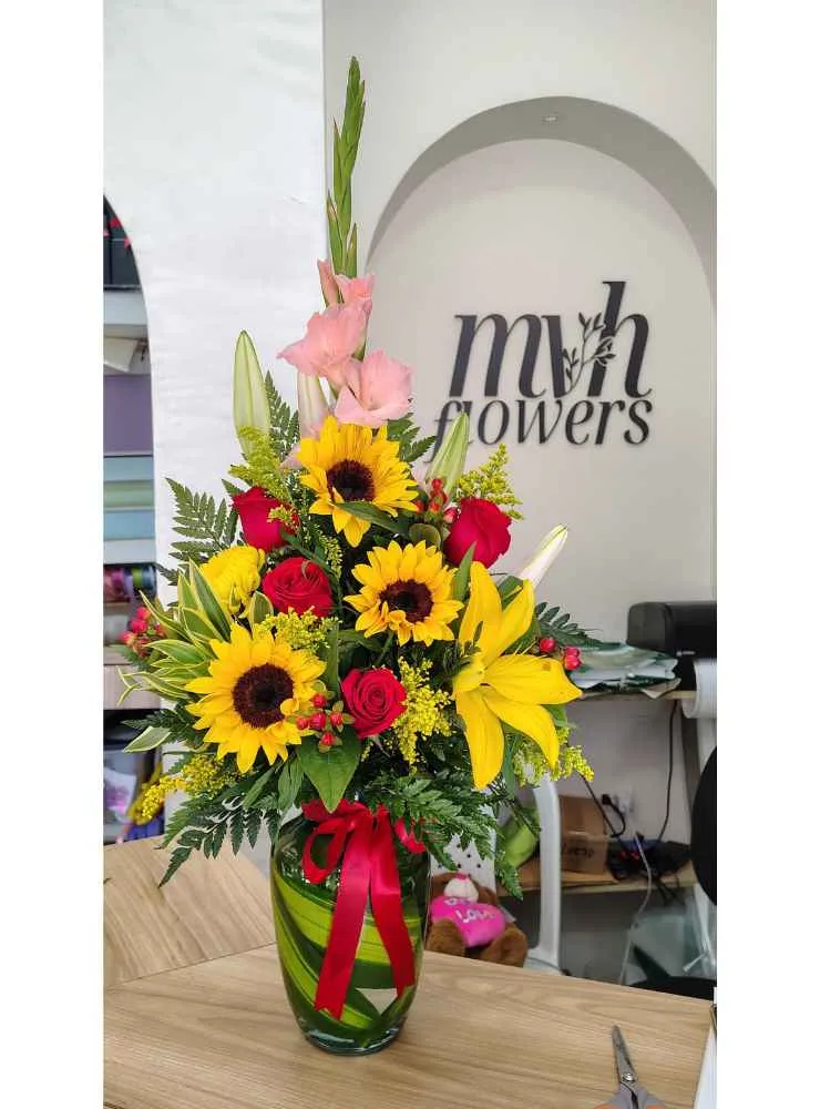 El Arreglo Girasoles y Rosas es una composición vibrante y alegre que combina la energía del sol con la pasión del amor. Con una armoniosa mezcla de girasoles, rosas rojas, lirios amarillos y toques de flores rosadas, este arreglo está diseñado para transmitir fuerza, optimismo y sentimientos sinceros. Todo dispuesto en un elegante florero de vidrio con follaje decorativo y un lazo que realza su presentación.