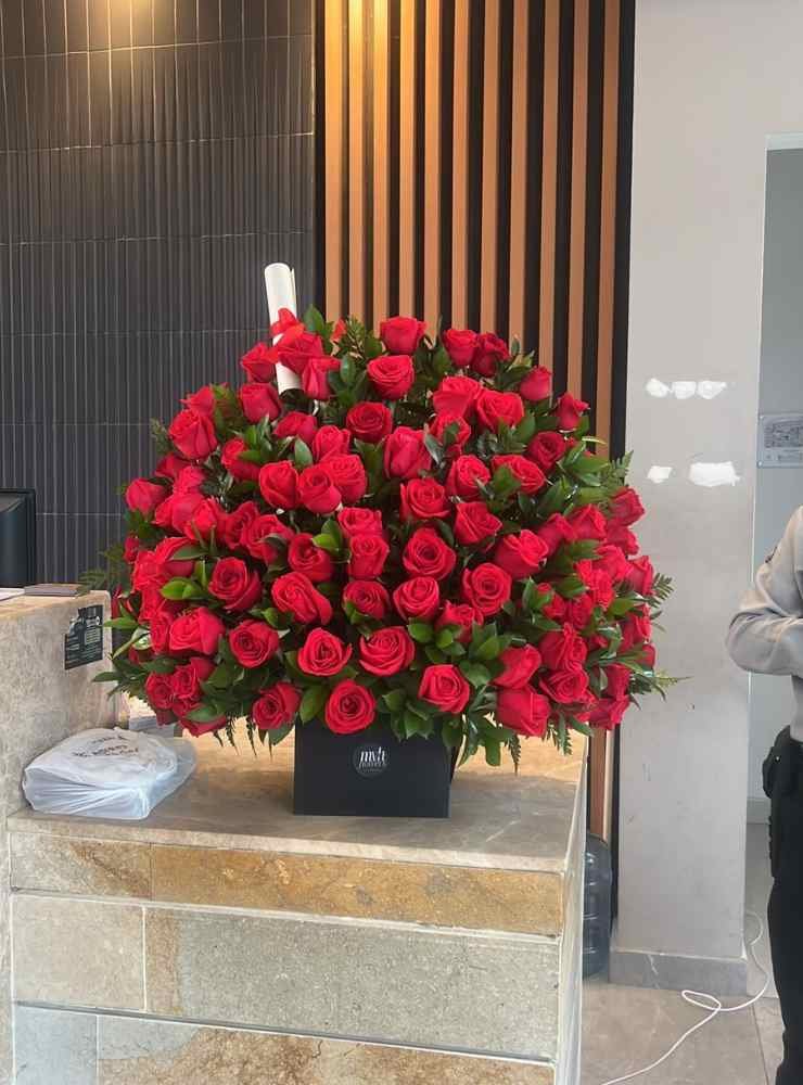 Este majestuoso arreglo está pensado para transmitir emociones profundas y memorables. Cada rosa simboliza amor, admiración y respeto, mientras que el follaje realza el contraste del rojo intenso, logrando un efecto visual impactante. Su tamaño y estructura le otorgan un carácter imponente que no pasa desapercibido.
