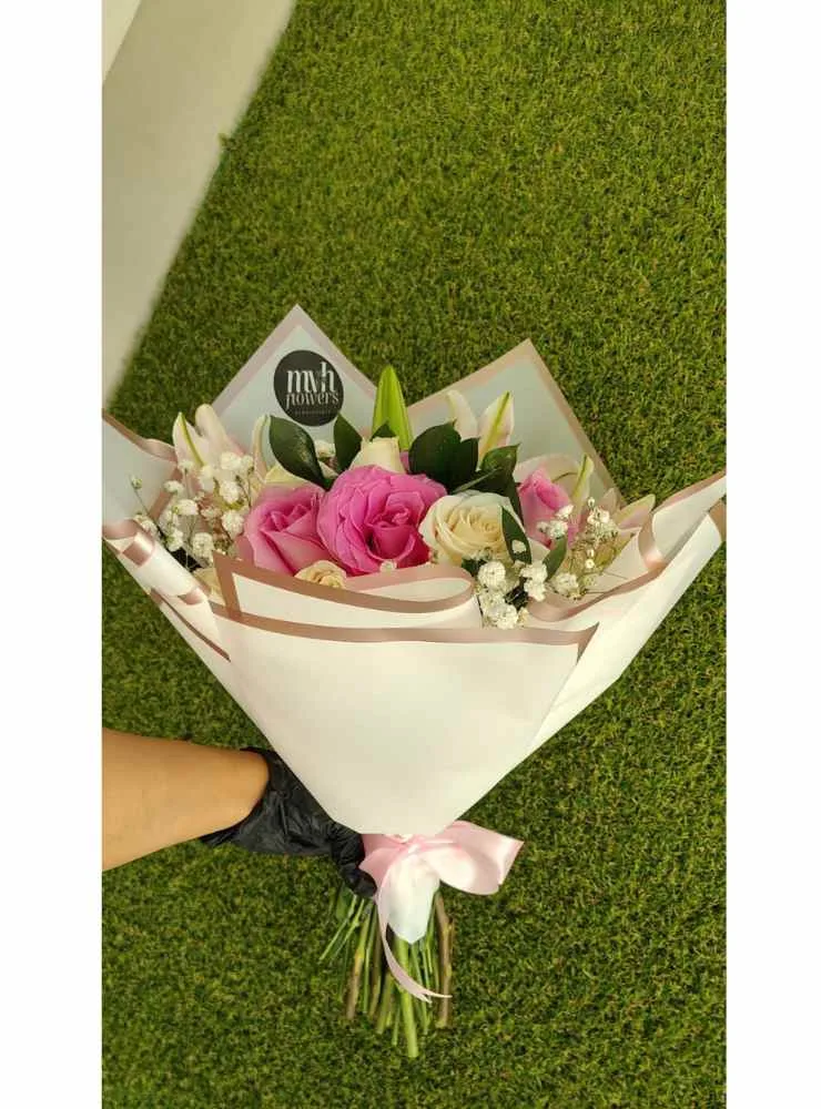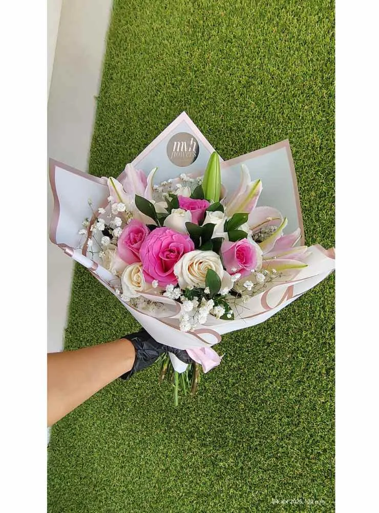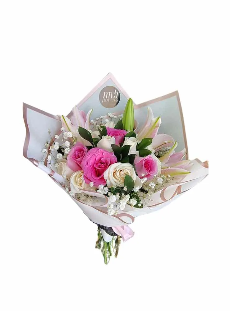 Es un arreglo floral elegante y sofisticado, diseñado para expresar sentimientos profundos y sinceros. Este diseño combina la belleza clásica de las rosas con la elegancia exótica de los lirios, creando una composición visualmente atractiva y llena de armonía. Quince rosas, simbolizan el amor, la amistad y la admiración. Los lirios, con sus pétalos delicados y su aroma embriagador, aportan un toque de sofisticación y misterio al conjunto. Delicados ramilletes de gypsophila añaden textura y un toque de ligereza al ramo. El ramo está envuelto en papel coreano de color claro, con un borde delicado que aporta un toque de elegancia. Un lazo de satén completa la presentación, aportando un toque final de sofisticación y delicadeza.