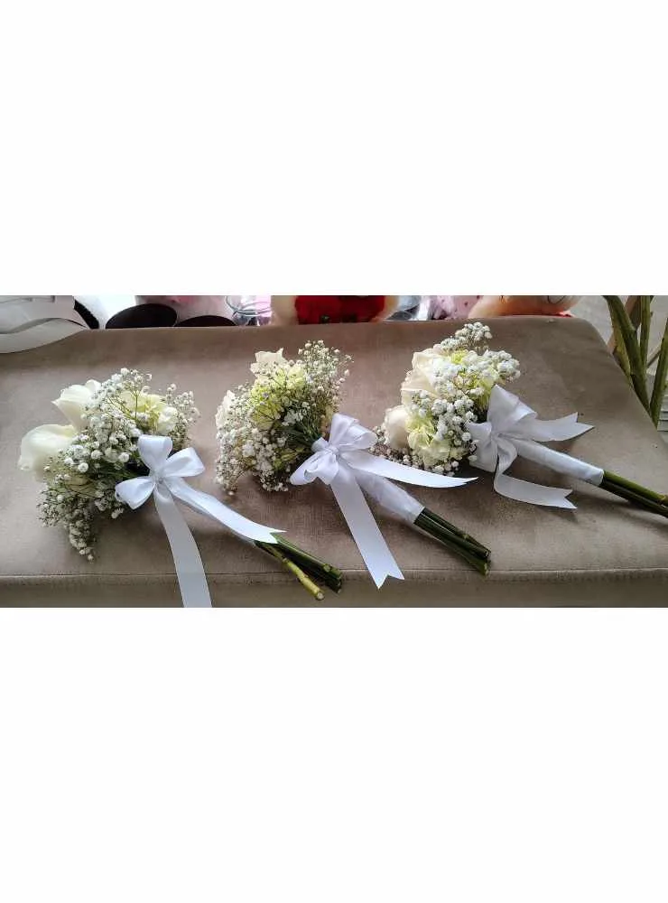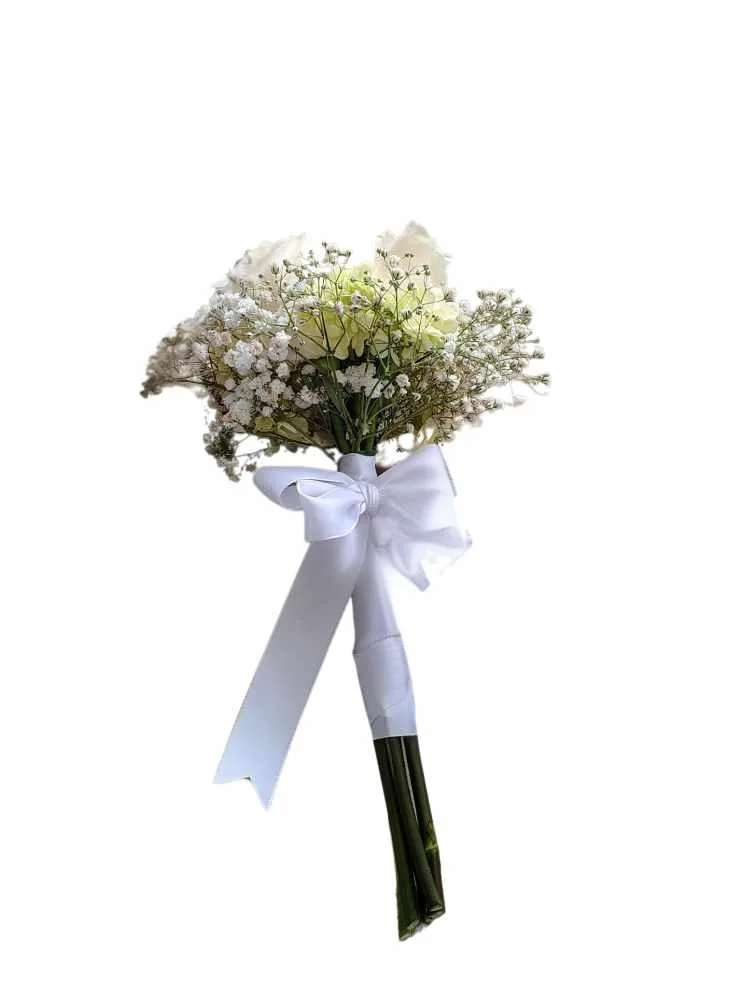 Es la definición de elegancia y sencillez, creado para acompañar a las damas de honor en uno de los días más importantes de sus vidas. Compuesto por 4 rosas blancas, símbolo de pureza y nuevos comienzos, y delicadas ramas de gypsophila que aportan un toque romántico y etéreo, este ramo está pensado para complementar con sutileza y encanto el atuendo de cada dama.