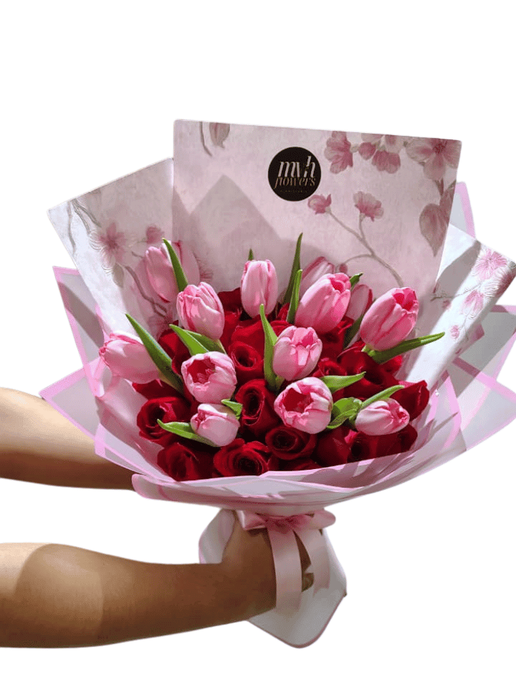 El Bouquet de Rosas y Tulipanes es una composición delicada y sofisticada que combina la intensidad del amor con la ternura de los detalles sutiles. La fusión de rosas rojas y tulipanes crea un contraste armonioso que transmite romanticismo, dulzura y elegancia atemporal. Su envoltura en papel coreano realza la belleza natural de cada flor, convirtiéndolo en un detalle memorable y lleno de significado.