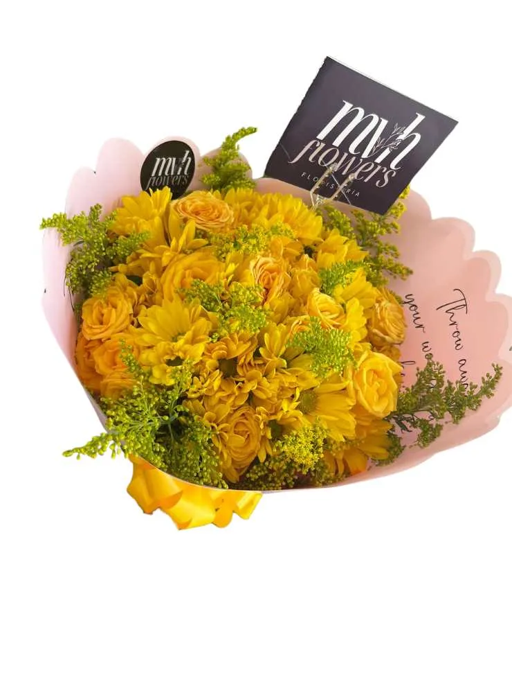 El bouquet de margaritas y rosas amarillas es una explosión de alegría y frescura que evoca los días soleados y la felicidad en cada pétalo. Este encantador arreglo es la combinación perfecta de la dulzura y la vitalidad que representan las margaritas, junto con la energía positiva y la calidez de las rosas amarillas. Juntos, crean una declaración floral que celebra la amistad, el amor y la felicidad.