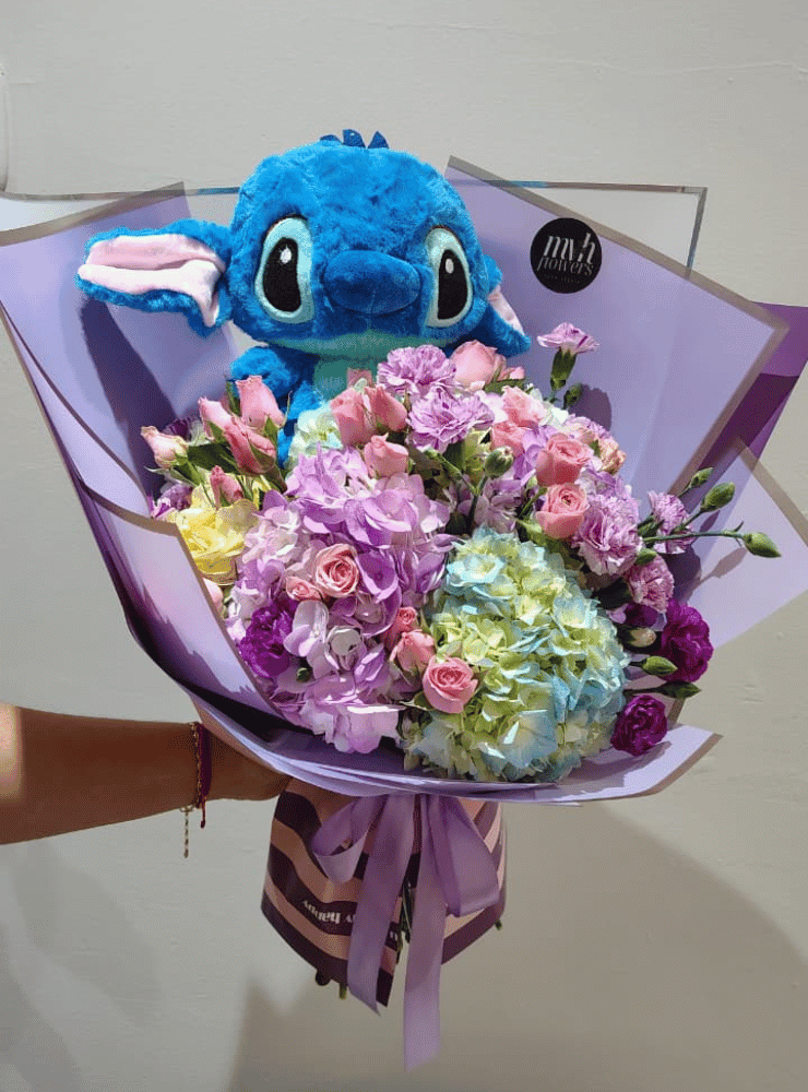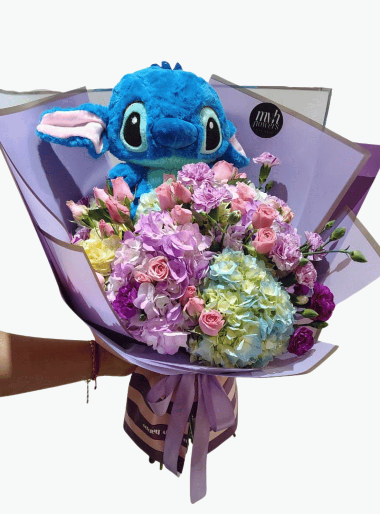 El Bouquet Hortensias y Stitch es una explosión de ternura, color y alegría, diseñado para sorprender y robar sonrisas desde el primer instante. La combinación de hortensias en tonos pastel, delicadas rosas y flores complementarias se une a un adorable peluche de Stitch, creando un arreglo único que transmite amor, dulzura y diversión. Su envoltura en papel coreano y el lazo satinado realzan su estilo encantador y moderno.