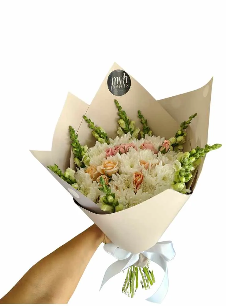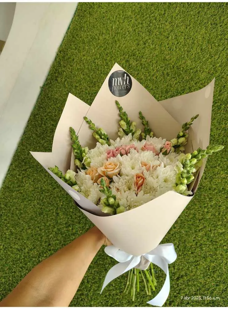El diseño se caracteriza por la combinación de flores en tonos neutros y pastel, creando una composición armoniosa y llena de serenidad. La estructura vertical de las bocas de dragón aporta altura y elegancia, contrastando con la forma redondeada de los crisantemos pompón y la delicadeza de las mini rosas.
