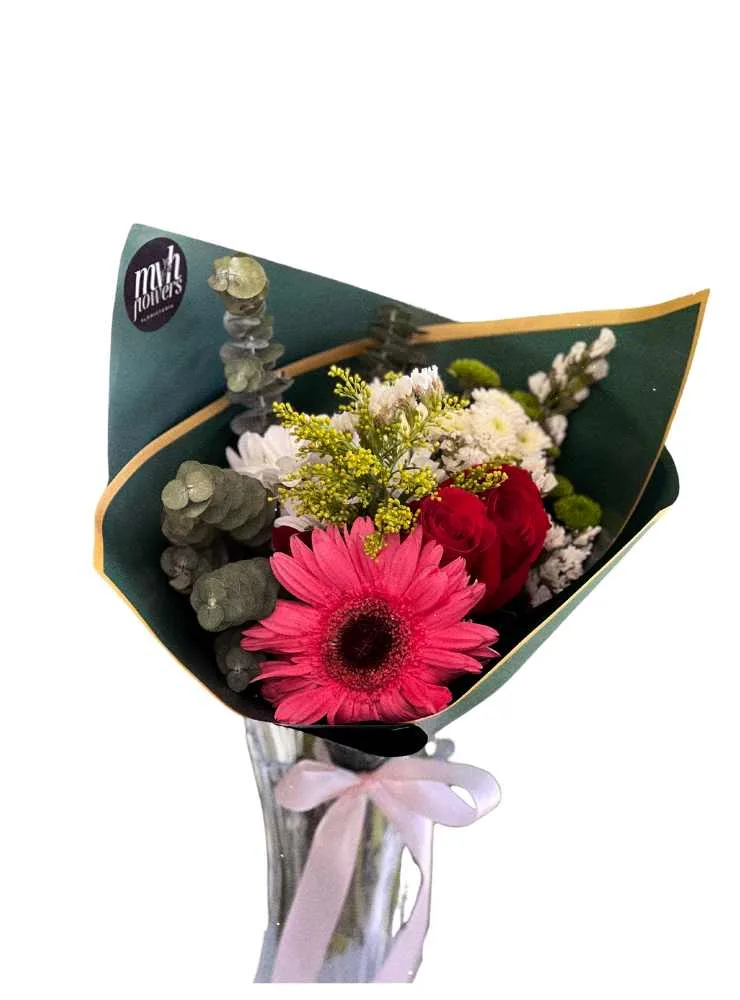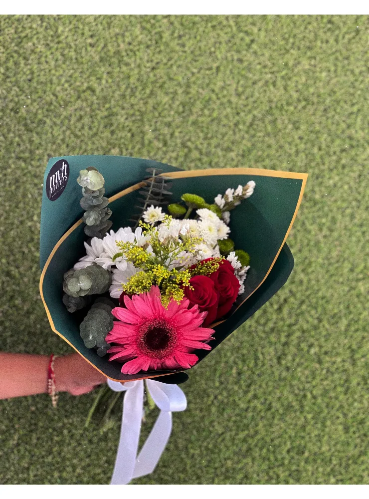 En este ramo, rosas frescas y delicadas se unen a margaritas brillantes, eucalipto fragante y una gerbera radiante, creando un conjunto de texturas y colores que impresiona. La flor Pinoquio, con su delicada belleza, es el toque perfecto para agregar un significado especial a este bouquet.