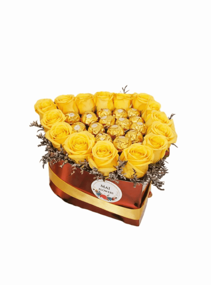 Es un arreglo floral que combina la pasión de las rosas con el placer del chocolate, creando un regalo inolvidable para expresar amor y afecto. Este diseño presenta una elegante caja en forma de corazón, rellena con quince rosas rojas y quince bombones de chocolate. Las rosas rojas, símbolo universal del amor, se disponen cuidadosamente alrededor del borde de la caja, creando un marco de pétalos suaves y aterciopelados. Los bombones de chocolate, envueltos en papel dorado, se ubican en el centro del corazón, añadiendo un toque de lujo y dulzura. Un listón dorado rodea la caja, aportando un toque final de elegancia y sofisticación.