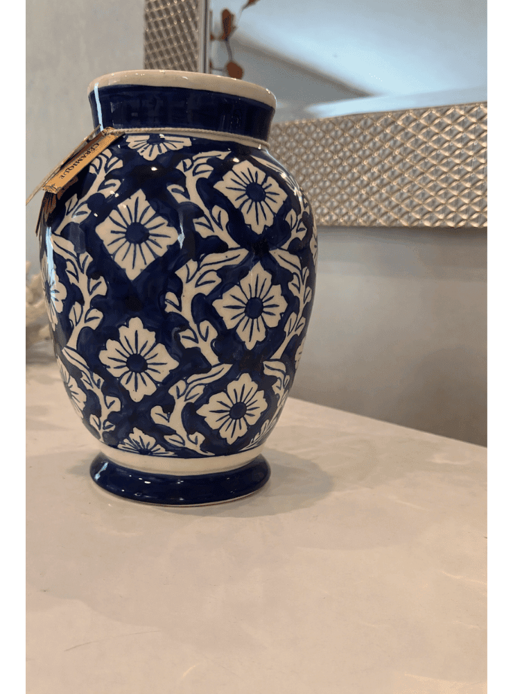 El Florero imperial Azul es una pieza decorativa que evoca elegancia tradicional con un aire refinado y atemporal. Su diseño en cerámica esmaltada combina un profundo tono azul con delicados motivos florales en blanco, creando un patrón armónico que aporta carácter y distinción a cualquier espacio.