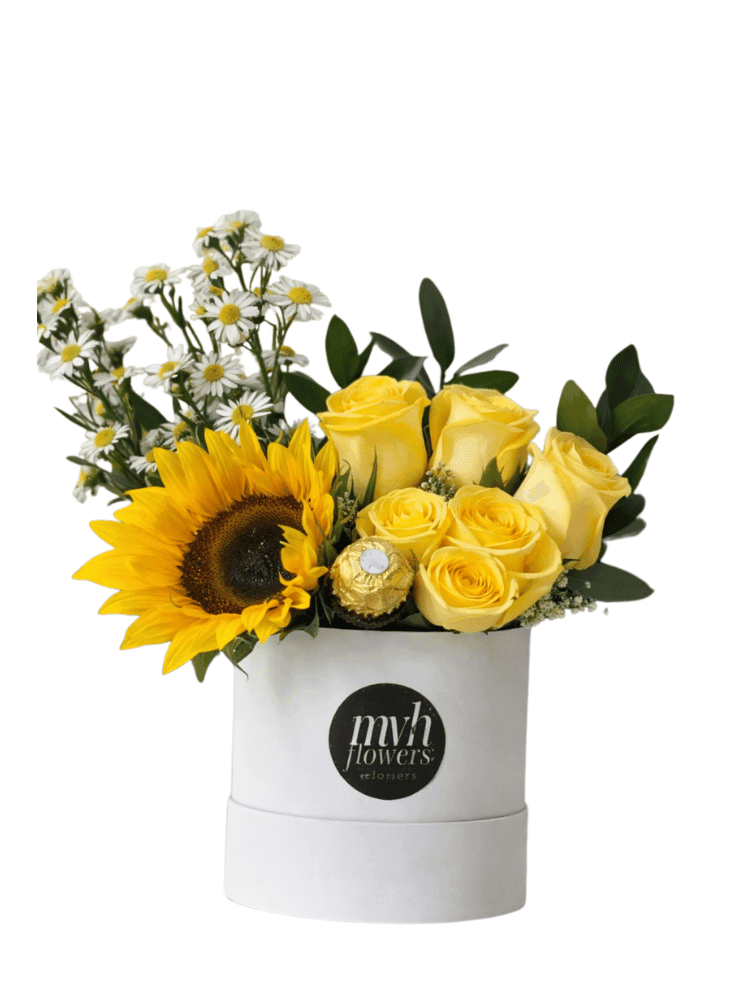Mini Sunflowers Box  es un arreglo floral pequeño y encantador, presentado en una elegante caja cilíndrica. Este diseño combina la alegría radiante de un girasol con la delicadeza de rosas y margaritas, creando una composición visualmente atractiva y llena de ternura. Un girasol, símbolo de vitalidad y energía positiva, es el centro de atención, rodeado de rosas y margaritas que aportan un toque de frescura y romanticismo. La inclusión de un chocolate de lujo añade un detalle dulce e inolvidable, perfecto para sorprender a alguien especial. La disposición de las flores es natural y armoniosa, destacando la belleza de cada elemento floral. La caja cilíndrica proporciona una presentación simple y elegante que complementa la belleza del arreglo.