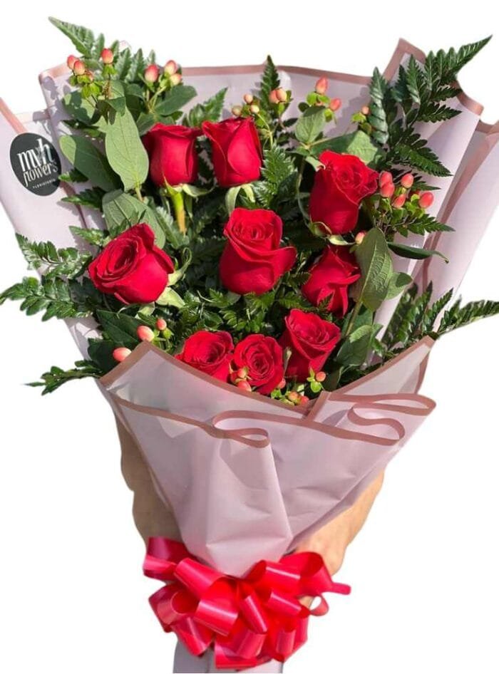 Ramo 9 Rosas es un arreglo floral elegante y romántico, compuesto por nueve rosas de tallo largo, cuidadosamente seleccionadas por su belleza y su intenso color. Las rosas, símbolo universal del amor apasionado, se disponen en un ramo que destaca su forma y su color profundo. El arreglo incluye delicados detalles de follaje verde que complementan la belleza de las rosas, creando una composición natural y armoniosa. Ramitas de Hypericum, con sus pequeñas bayas rojas, añaden un toque de color y textura adicionales, sin distraer la atención de la belleza principal de las rosas. El ramo está envuelto en un papel de seda color beige claro, con un borde rosado que aporta un toque de delicadeza y sofisticación. Un lazo rojo brillante completa el arreglo, aportando un toque de pasión y alegría.